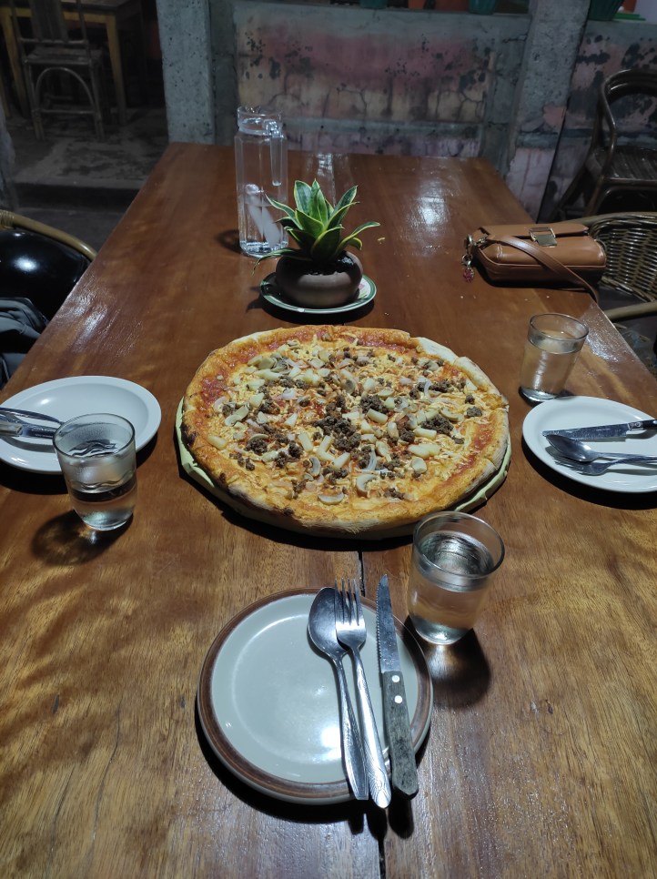 One thing you have to know about pizzas here in Palawan is they’re pretty small in serving most of the time. That’s what we also thought about Neva’s Place especially with their “Kuripot” size. (“kuripot” means “cheap”) But it turns out, they’re actually large enough for a serving for 4. And on our first try, we had more than we could eat since I ordered two servings. But that’s what makes the place amazingly cheap and worth every penny.